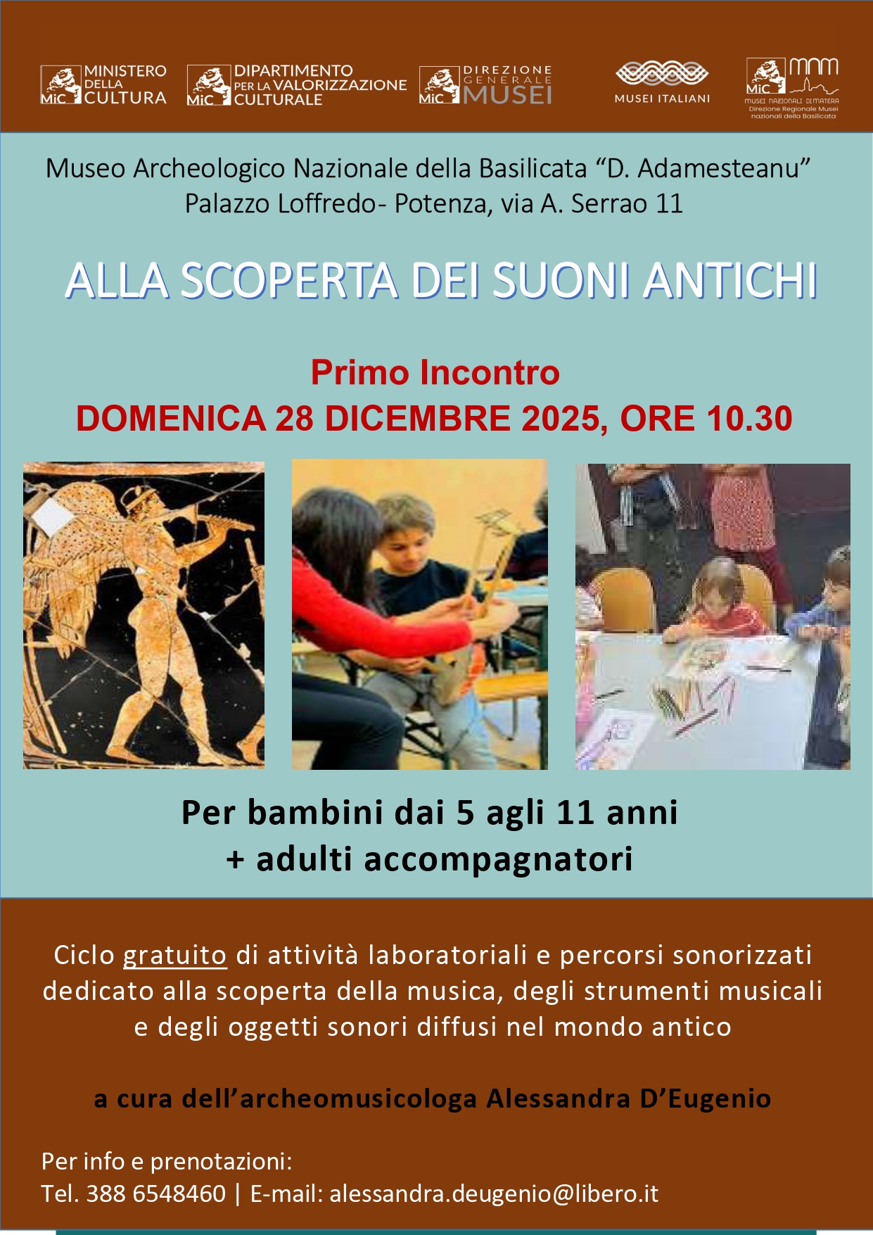 Ciclo gratuito di attività laboratoriali e percorsi sonorizzati dedicato alla scoperta della musica, degli strumenti musicali e degli oggetti sonori diffusi nel mondo antico a cura dell’archeomusicologa Alessandra D’Eugenio.