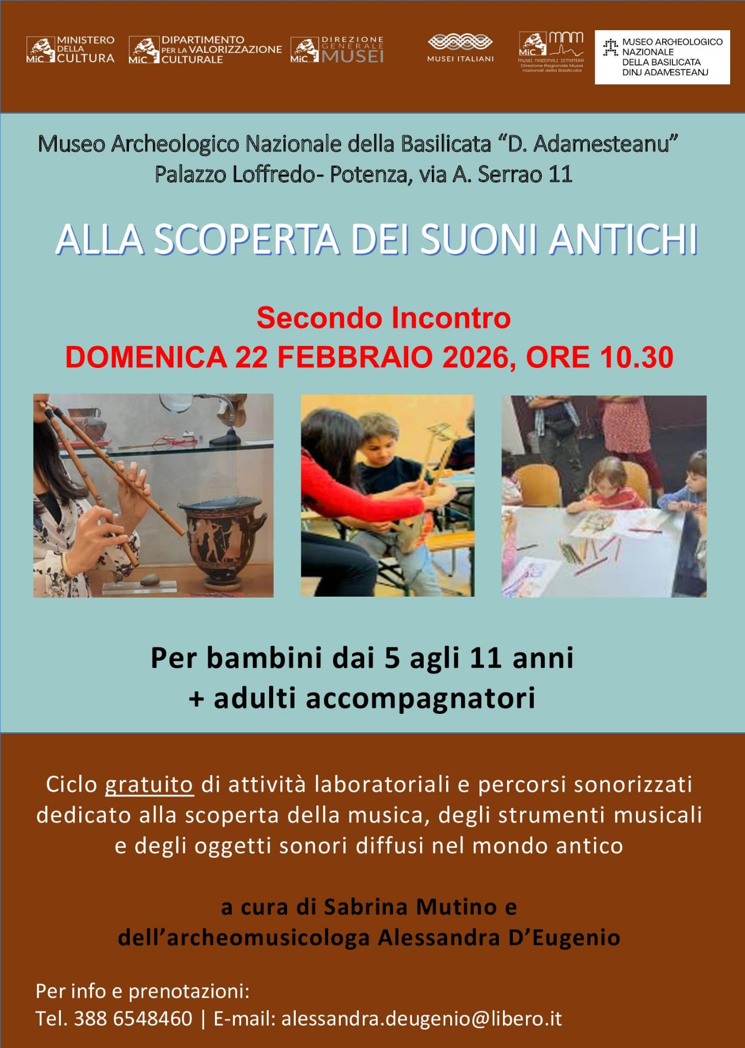 Questo incontro rientra in un ciclo gratuito di attività laboratoriali e percorsi sonorizzati dedicato alla scoperta della musica, degli strumenti musicali e degli oggetti sonori diffusi nel mondo antico.