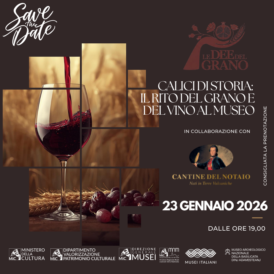 Lo scopriremo in appuntamento straordinario che unisce archeologia, memoria e territorio. Il Museo apre le sue porte a un ospite d’eccezione: l’azienda vitivinicola Cantine del Notaio, che ci accompagnerà in un viaggio a ritroso nel tempo.