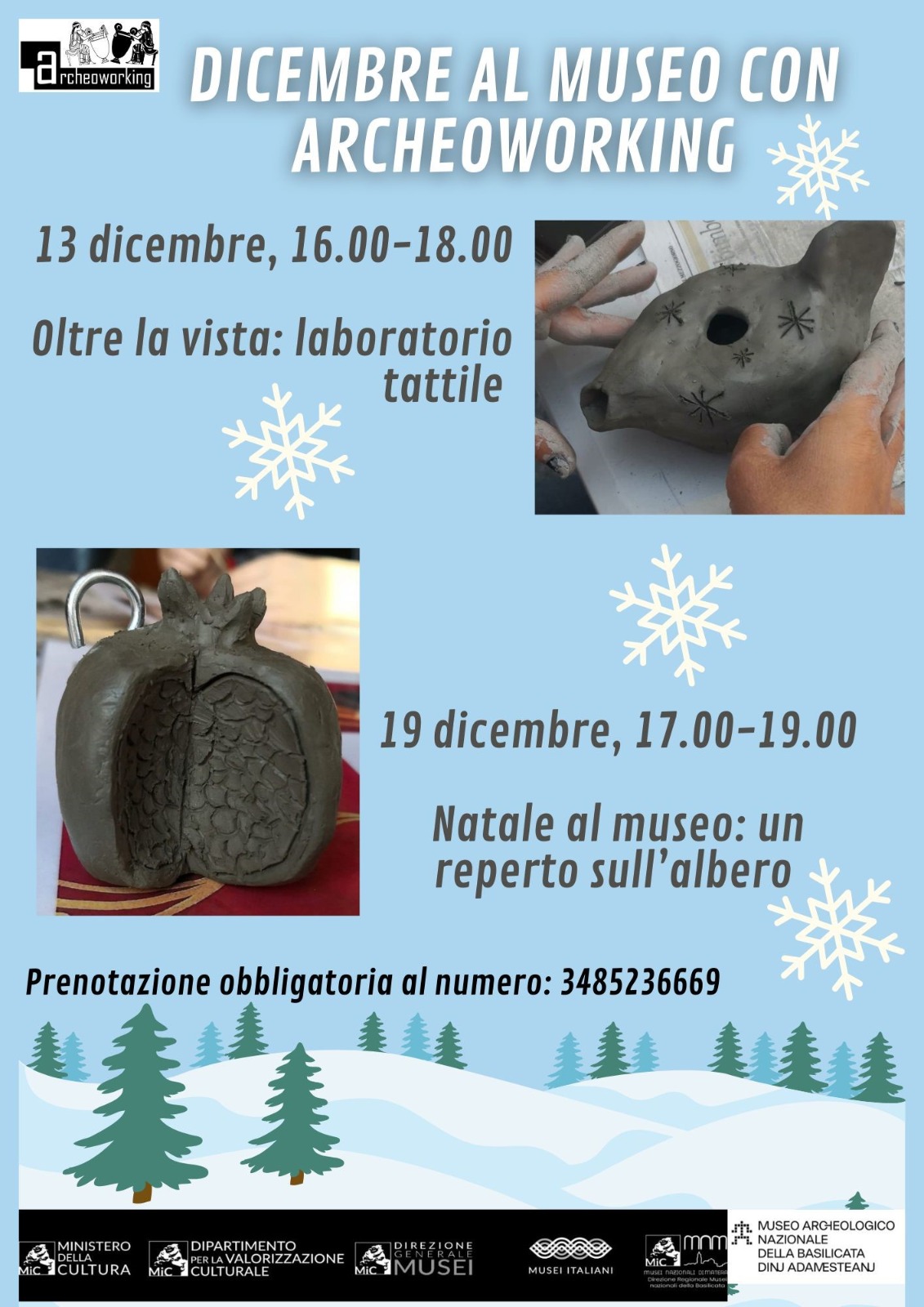 Il Museo Archeologico Nazionale “Dinu Adamesteanu” di Potenza, in collaborazione con l’Associazione Archeoworking, è lieto di presentare ai suoi piccoli visitatori “Oltre la vista: laboratorio tattile” “Natale al museo: un reperto sull’albero”, pomeriggi di visite e laboratori di archeologia sperimentale per bambine e bambini