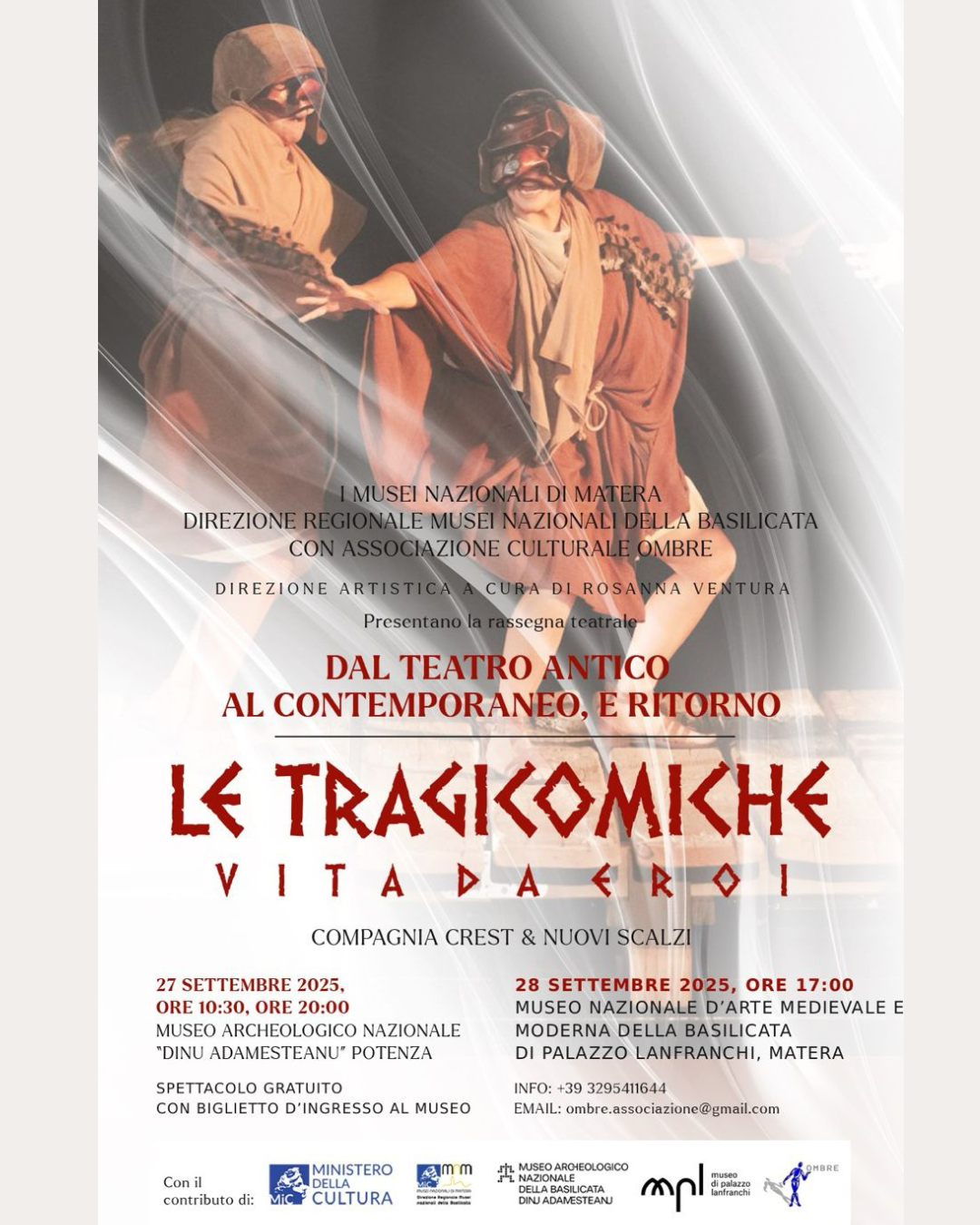 Il 27 settembre, l’Associazione Culturale Ombre, con lo spettacolo “LE TRAGICOMICHE, vita da eroi” con la compagnia “Crest” e “I Nuovi Scalzi” racconta con ironia le gesta di Achille e lo scontro generazionale tra giovani e adulti detentori del potere.